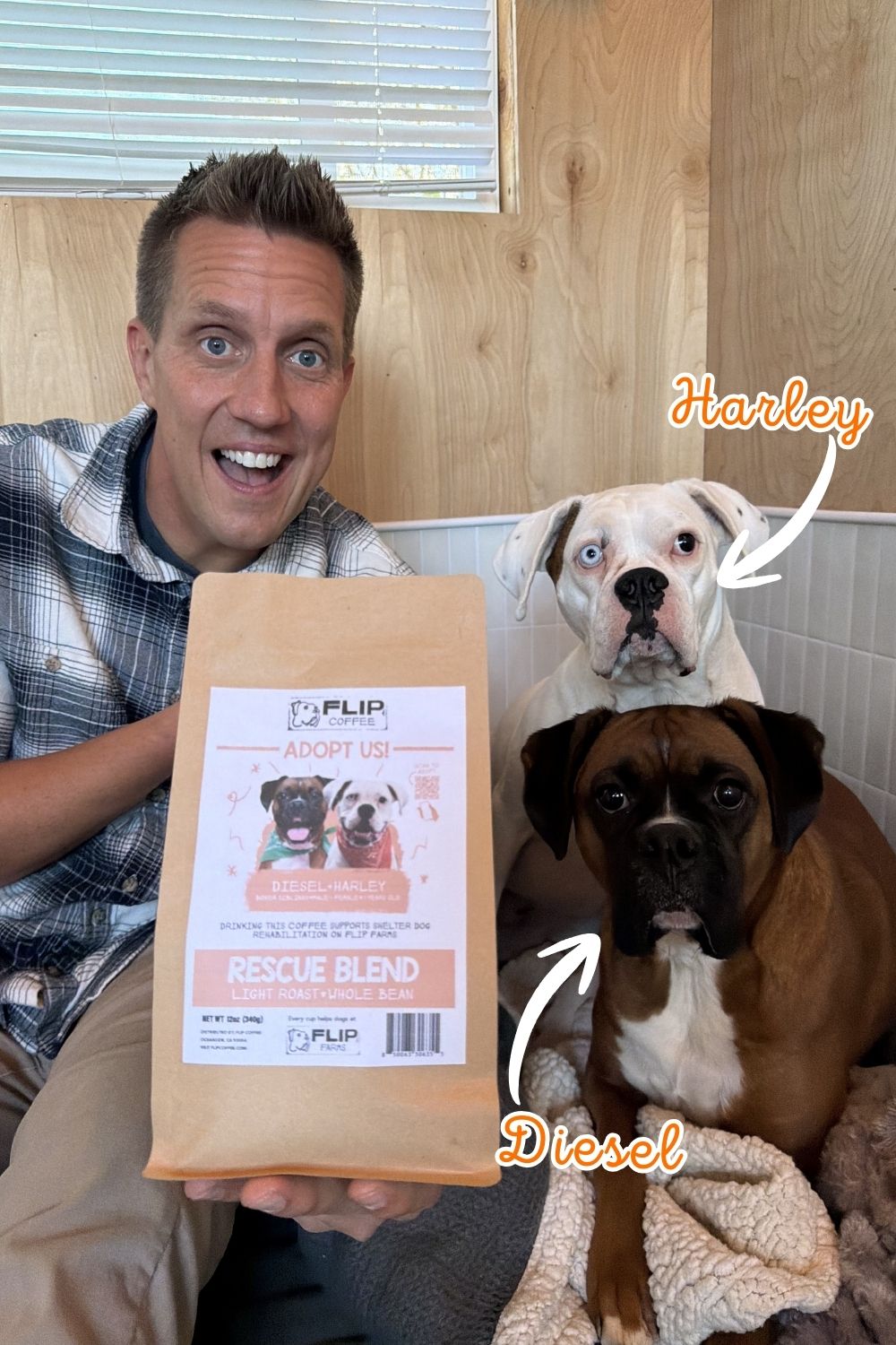 Now, here’s something I’m really excited about. We did something special for these two – we created a limited edition Flip Farms rescue blend coffee just for Diesel and Harley. Their faces are right on the bag. It’s our first ever light roast, made with organic beans from Peru, and we only made 1,000 of them. When they’re gone, they’re gone.