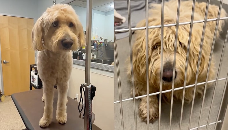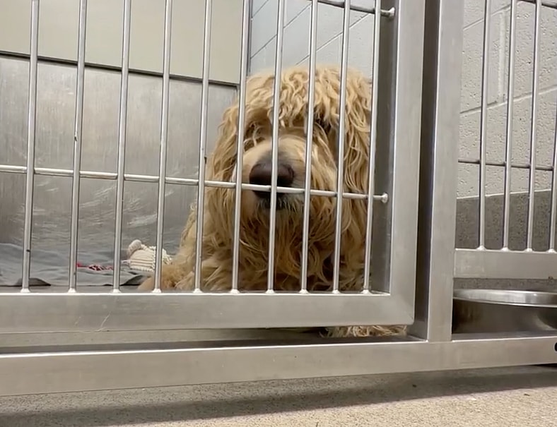 He was frozen to the floor of his kennel – a big, matted doodle who could barely move without wincing in pain. His fur was so badly neglected that just turning his head pulled at his skin. Years of mats had essentially trapped him inside his own coat. The smell was overwhelming. His nervous system was so shot that he wasn’t even reacting like a dog anymore – just lying low, ears alert, eyes wide, doing everything he could to survive another moment.