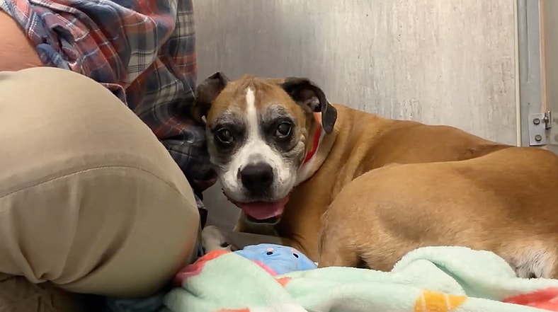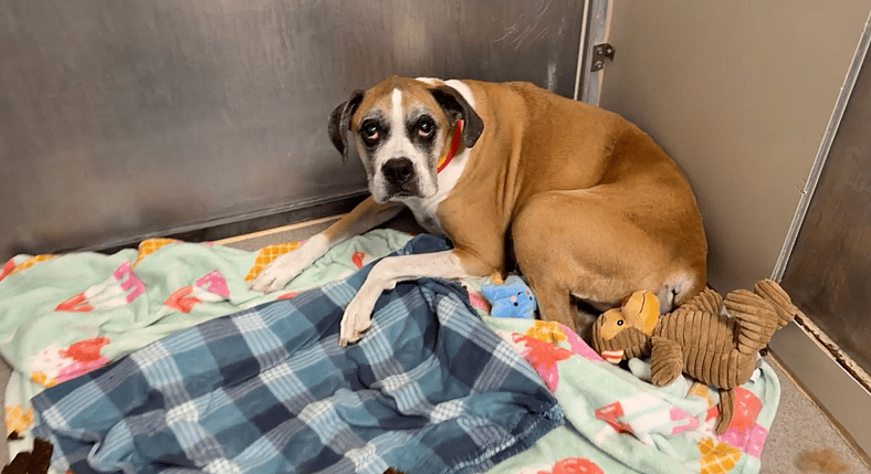 Syndey arrived at Animal Friends of the Valleys quietly. No barking. No pulling at the gate. Just a senior Boxer standing frozen in the back of her kennel, eyes wide, body stiff, overwhelmed by noise she did not understand.