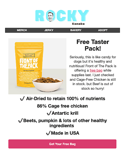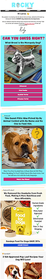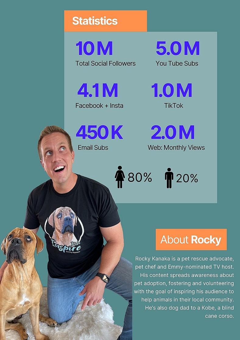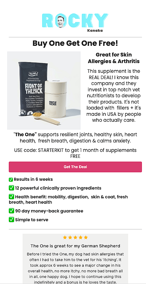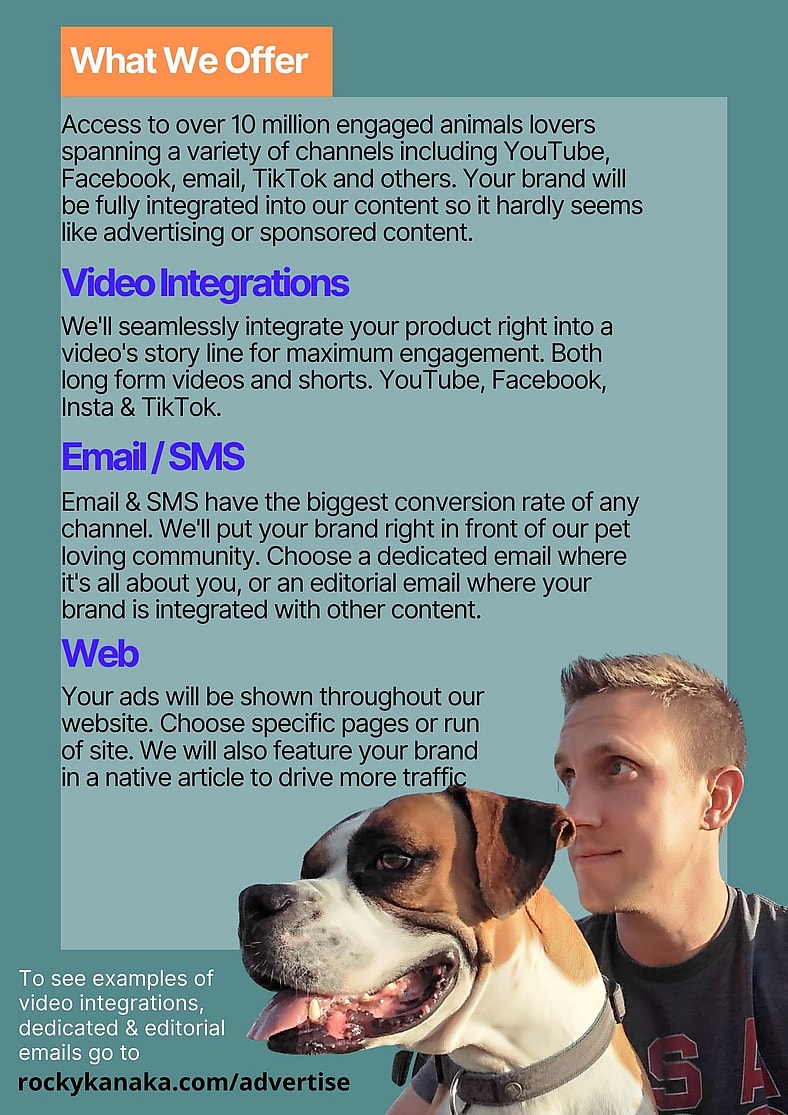 Advertise With Us! Examples of Sponsor Integrations: Integration for Sundays For Dogs starts at 14:27 Integrations for Furbo Dog Camera at :41 and 6:45 Integration for AlphaPaws at :16, 3:48 and 20:15 integration For Pet Smart in ‘short’ video format @rockykanakaofficial Is today the day you find your best friend?! 🐶❤️ #HillsPartner #HillsFoodShelterLove #hillspetnutrition ♬ original sound – rockykanaka Integration for Hills Pet Food Integration for Google Ads at 3:08. Email Marketing Examples Dedicated Email Dedicated Email Newsletter Style