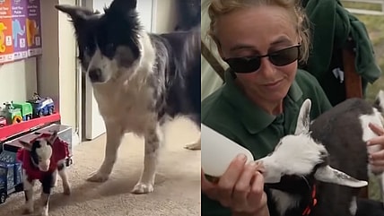 Rejected at birth, Lil the goat found love with two Border Collies. Now she lives like a sheepdog, rounding up…