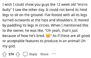 “ [Micro Bully breeders] would often come in,” said a vet tech in a comment on Reddit, “The dogs hardly able to walk, never seeming fully “with it” cognitively, in comparison to other dogs, and always breathing so loud that I constantly check their gum color. I mean, the breathing sounds are horrific.”