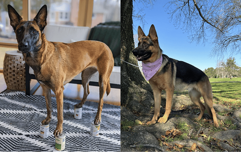Let’s look at a quick comparison of these two breeds with the Malinois on the left and the GSD on the right.