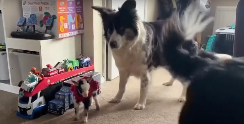 The caravan just so happens to be home to two Border Collies, Luna and Nya, the farm’s working sheepdogs. From the very beginning, the pups took Lil under their wing, treating her like one of their own. They groom her, play with her, and even snuggle her to sleep.