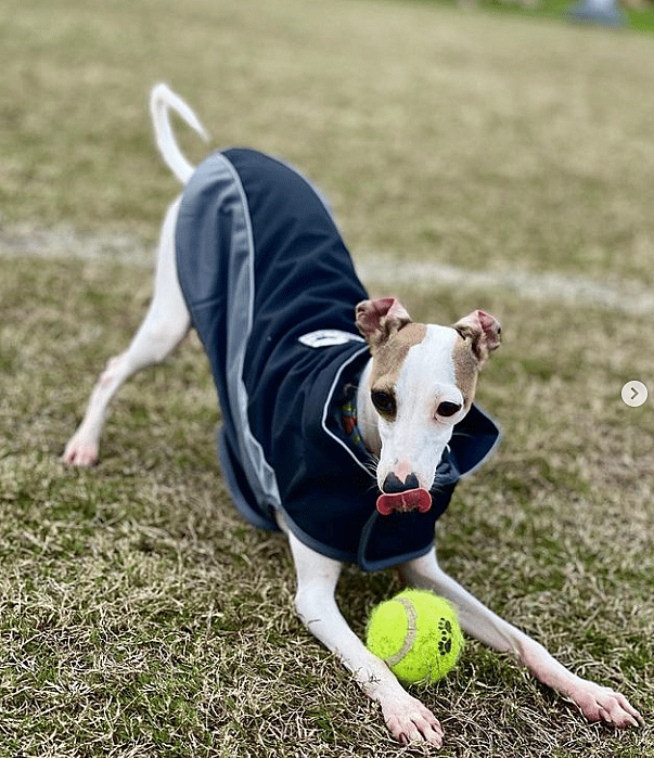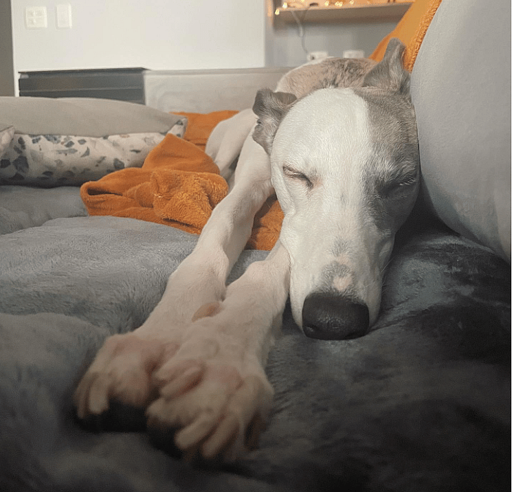 Greyhounds are quiet, sweet, and enjoy lots of lazy time like a cat. They love nothing more than to cuddle and curl up in a ball on the couch or the floor. When they do run outside or around the house though, they’re pretty speedy.