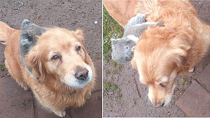 A Golden Retriever in Australia surprised her dad by making friends with a baby koala who climbed onto her back,…