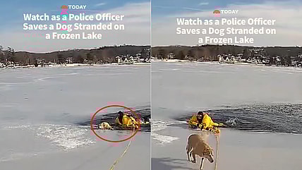 A dog fell through a frozen New Jersey lake, but a quick-thinking officer raced across the ice to save her,…